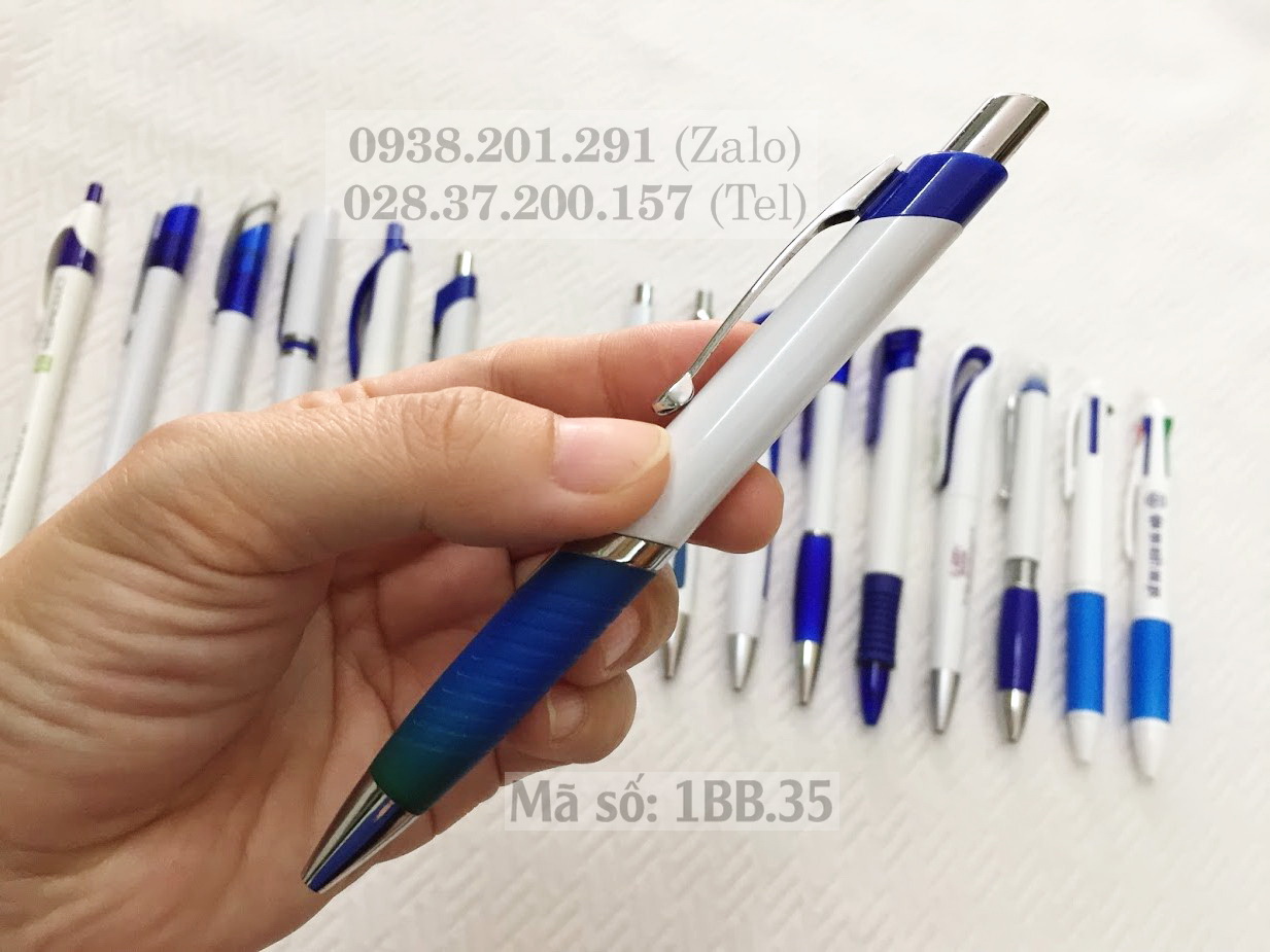 Bút bi nhựa mã số 1BB.35 thân bút màu trắng, phối màu xanh dương, cài bút màu bạc, có thể in quảng cáo ở thân bút màu trắng rất rõ ràng