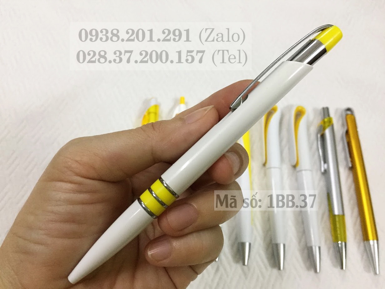 Bút bi nhựa mã số 1BB.37 là mẫu bút thân màu trắng, phối màu vàng ở đầu bút và phần giữa bút, có thể in logo và tên công ty làm quà tặng quảng cáo giá rẻ để tặng số lượng nhiều ở các sự kiện lớn như khai trương, hội chợ, triển lãm, khai giảng, ngày hội tuyển sinh...