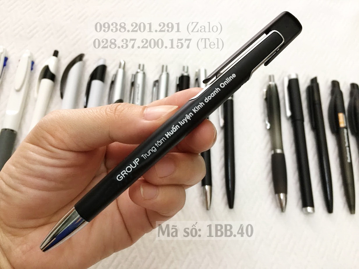 Bút bi nhựa mẫu 1BB.40 có thân màu đen, phối line viền màu trắng bạc, in nội dung màu trắng lên thân bút rất đẹp và độc đáo