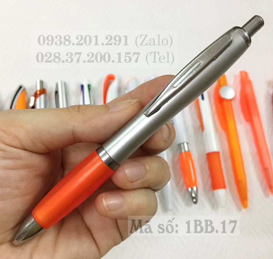 Bút bi nhựa này có thể dùng để in logo lên thân bút theo màu sắc logo, tên công ty của bạn rất phù hợp. Bút viết bi nhựa mã số 1BB.17 màu cam phối màu bạc