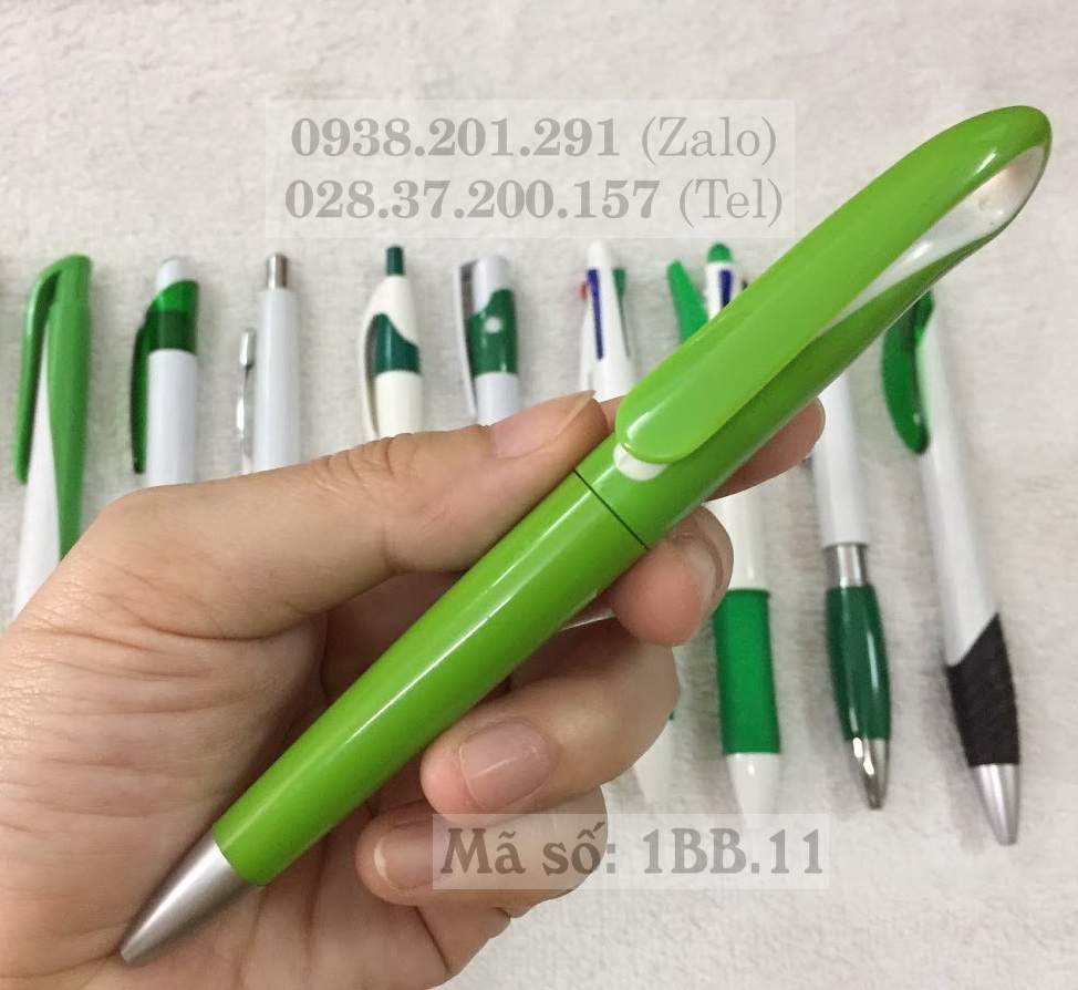 Bút bi nhựa mã số 1BB.11 là kiểu bút bi thân hơi mập, đầu gù uốn cong, khi sử dụng thì vặn thân bút ngòi bút sẽ đưa ra để sử dụng. Đây là mẫu viết nhựa toàn thân màu xanh lá cây rất đẹp, có thể in tên công ty để làm quà tặng quảng cáo