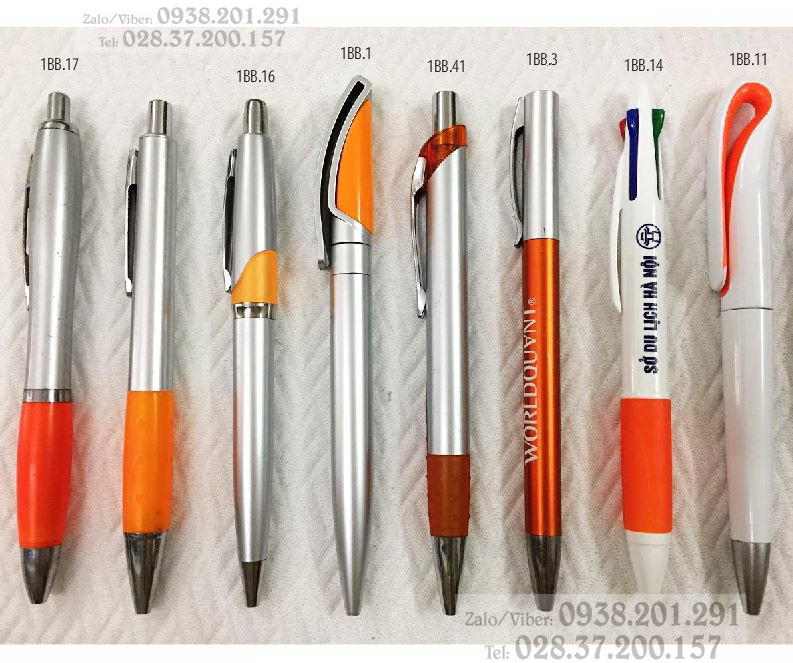 Các mẫu bút bi nhựa từ 1BB.17, 1BB.16, 1BB.1, 1BB.41, 1BB.3 là các mẫu bút bi màu nhũ bạc phối màu cam ở thân bút rất nổi bật. Nội dung in ấn có thê thực hiện trên phần màu bạc hoặc màu cam, rất nổi bật và rõ ràng. Mẫu bút bi nhựa 1BB.14 là mẫu bút bi nhựa 4 ngòi, có thể in nội dung ở phần thân bút màu trắng