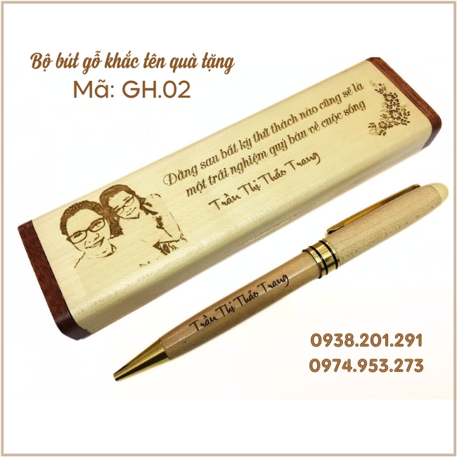 Bộ bút gỗ khắc tên mã số GH.02 rất đẹp và độc đáo, có thể khắc tên, nội dung đề tặng cho khách hàng, người thân, bạn bè, thầy cô giáo nhân các dịp đặc biệt như sinh nhật, khai trương, kỷ niệm...